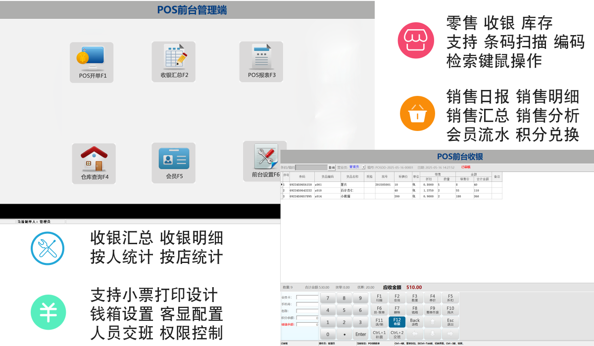 打印功能:连接票据打印机打印购物小票、发票等。